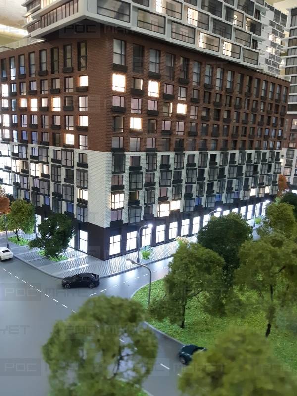 Макет «ЖК Событие», масштаб 1:170 по адресу: г. Москва, ЗАО, р-н Раменки, между ул.Лобачевского и платформой «Матвеевская». Высота здания (max отм.) в параметрах масштаба: 580мм. Электрификация макета: 50% жилых помещений с хаотичным их включением/выключением, управляемым из контроллера (белое теплое свечение). Предусмотрена постоянная подсветка общественных мест здания. Предусмотрены городские мачты освещения и уличные парковые фонари.