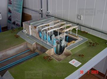 Промышленный макет в масштабе 1:100 позволяет ознакомиться с устройством и принципом работы очистных сооружений. Для изготовления реалистичной копии макетная мастерская использовала пластик, оргстекло и картон, технологии лазерной резки и трехмерной печати. Модель отображает основные технологические узлы сооружения: септики, камеры биологической и физико-химической очистки. Для большей наглядности макет дополнен динамическими элементами.