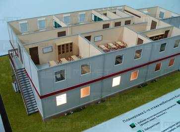 С помощью макета мобильного учебного комплекса можно оценить архитектурное и планировочное решение здания и его внутреннее оснащение. Модель в масштабе 1:42 не имеет крыши, что позволяет рассмотреть планировку и интерьер учебных аудиторий, лаборантских, административных и вспомогательных помещений. Для изготовления копии макетная мастерская использовала пластик, картон и оргстекло. Прототип подходит для демонстрации инвесторам и участникам специализированных выставок.