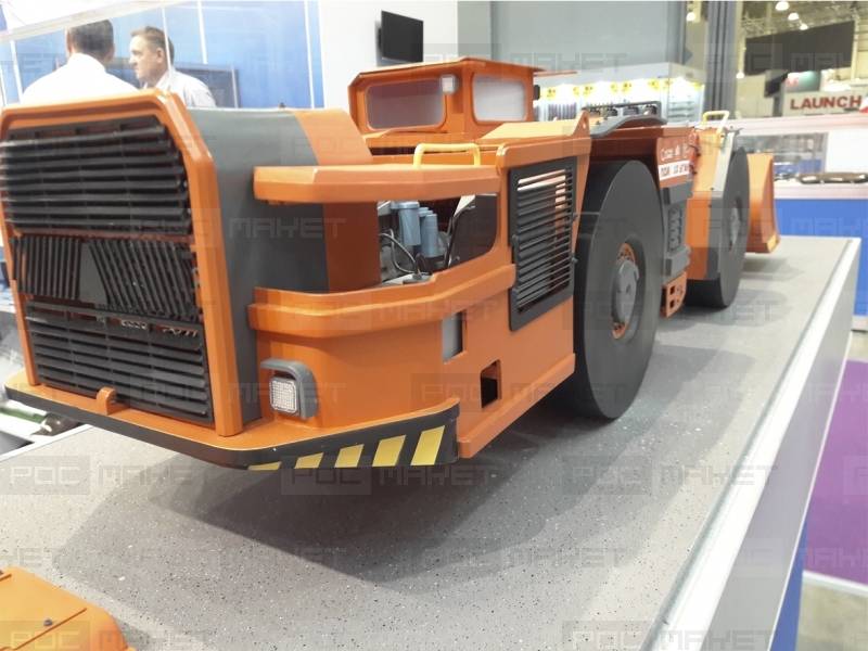Масштабный макет погрузочно-доставочной машины (ПДМ) изготовлен в нашей макетной мастерской из оргстекла, полистирола и модельного пластика. Реалистичная модель в масштабе 1:10 позволяет продемонстрировать конструкцию и функциональные возможности автотехники. При необходимости макет и его отдельные элементы (в частности, стрела с ковшом) приводится в движение с помощью действующего механизма. Прототип может использоваться для выставочных и учебных целей.