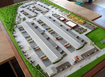 Макет складского комплекса обеспечивает целостное восприятие производственной территории. Промышленный объект просматривается с разных ракурсов, что позволяет найти наиболее функциональное решение для эксплуатации складских помещений. Модель демонстрирует расположение терминалов, зон погрузки и разгрузки, вспомогательных зданий и сооружений. Для большей реалистичности макет снабдили деталями окружающего ландшафта, моделями грузового и легкового транспорта. Макетная мастерская выполнила модель в масштабе 1:200 с использованием пластика, ПВХ, акриловых красок и рулонной травы для макетирования.