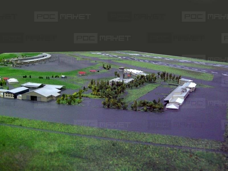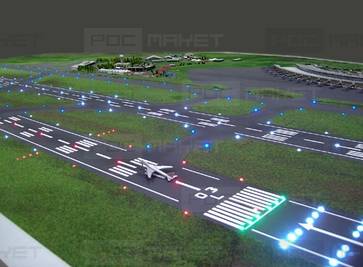 Макет территории Аэропорта выполнен нашей макетной мастерской в границах существующего положения с применением светодиодной подсветки взлетной полосы, а так же её разметки.