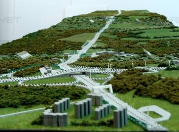 Настольный концептуальный макет в масштабе 1:1200 демонстрирует проект автодороги М-3 «Украина». Модель изготовлена с использованием полистирола, бутафорий и гипсовых полимеров. Реалистичная копия позволяет ознакомиться с основными конструктивными элементами проекта: эстакадами и наземными трассами (двух и четырехполосными), развязками и надземными пешеходными переходами. Дополняют макет изображения окружающего ландшафта и инфраструктуры.